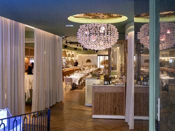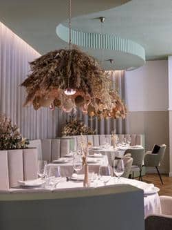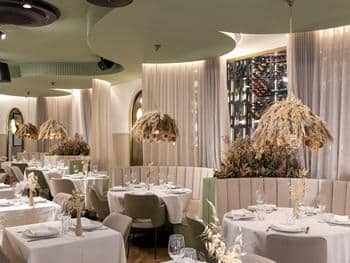 También es fundamental la disposición de las mesas, que aseguran amplitud, privacidad y comodidad. Están vestidas con manteles blancos y una vajilla clásica, que eleva la sensación de elegancia. El mobiliario combina sillas tapizadas en tonos neutros y sofás curvos que abrazan mesas redondas, creando rincones íntimos para compartir. Destaca una espectacular vinoteca acristalada en la pared principal, que no solo exhibe la extensa selección del restaurante, sino que también funciona como un punto focal decorativo y funcional.
