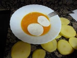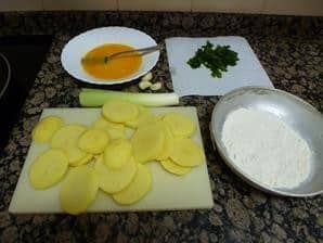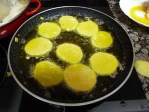 Primero pelamos las patatas y las lavamos, a continuación hacemos rodajas de 1 cm. De ancho aproximadamente, las salamos, una vez saladas las pasamos por la harina que tenemos preparada en un recipiente lo suficientemente ancho y alto para que no se nos salga nada de la harina, a continuación las pasamos por el huevo el cual ya tenemos batido y las freímos en el aceite bien caliente, cuando las veamos doradas las sacamos a un recipiente en el cual habremos puesto un papel absorbente para de esa manera quitar el aceite sobrante y no se nos queden aceitosas.